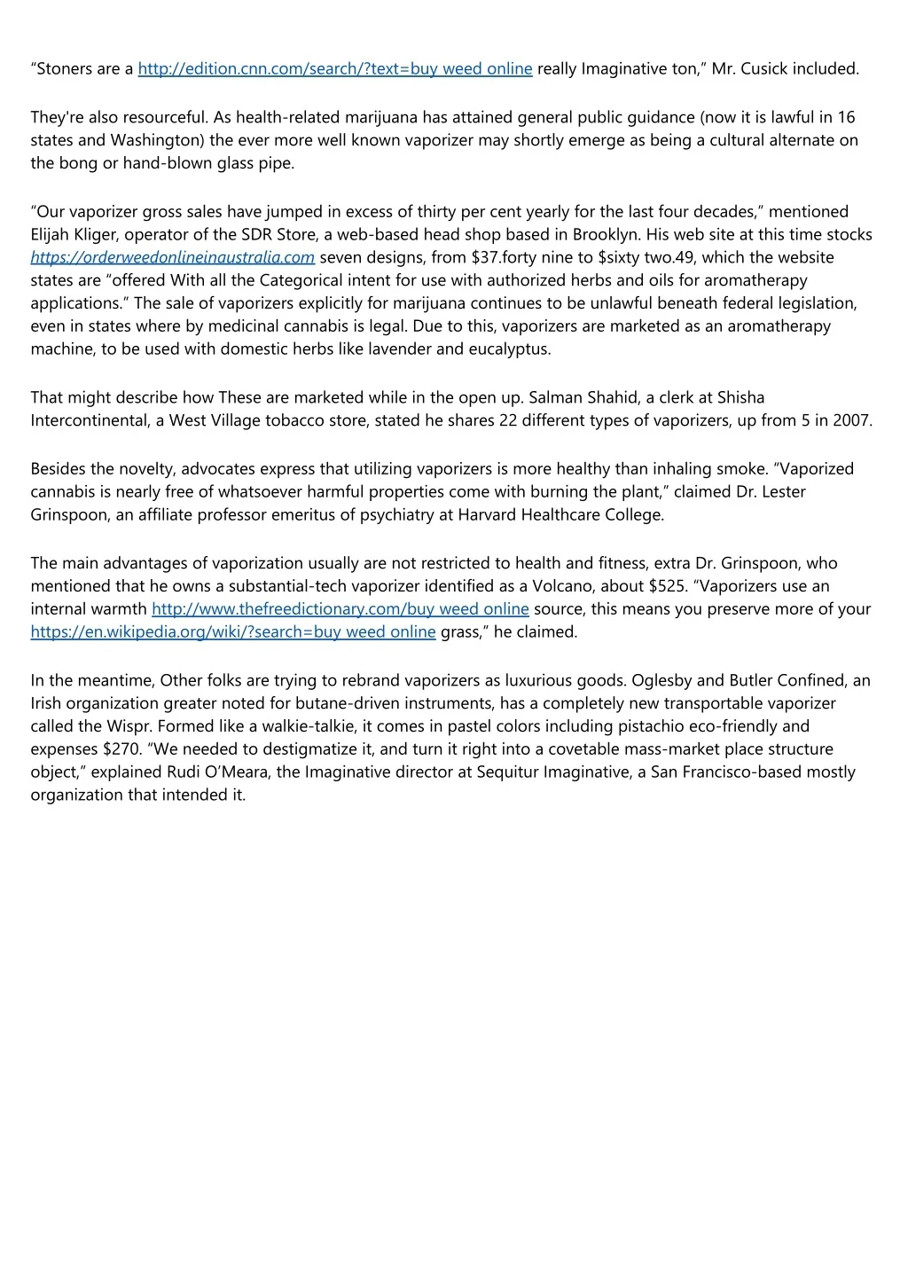 “Stoners are a http://edition.cnn.com/search/?text=buy weed online really Imaginative ton,” Mr. Cusick included. They're also resourceful. As health-related marijuana has attained general public guidance (now it is lawful in 16 states and Washington) the ever more well known vaporizer may shortly emerge as being a cultural alternate on the bong or hand-blown glass pipe. “Our vaporizer gross sales have jumped in excess of thirty per cent yearly for the last four decades,” mentioned Elijah Kliger, operator of the SDR Store, a web-based head shop based in Brooklyn. His web site at this time stocks https://orderweedonlineinaustralia.com seven designs, from $37.forty nine to $sixty two.49, which the website states are “offered With all the Categorical intent for use with authorized herbs and oils for aromatherapy applications.” The sale of vaporizers explicitly for marijuana continues to be unlawful beneath federal legislation, even in states where by medicinal cannabis is legal. Due to this, vaporizers are marketed as an aromatherapy machine, to be used with domestic herbs like lavender and eucalyptus. That might describe how These are marketed while in the open up. Salman Shahid, a clerk at Shisha Intercontinental, a West Village tobacco store, stated he shares 22 different types of vaporizers, up from 5 in 2007. Besides the novelty, advocates express that utilizing vaporizers is more healthy than inhaling smoke. “Vaporized cannabis is nearly free of whatsoever harmful properties come with burning the plant,” claimed Dr. Lester Grinspoon, an affiliate professor emeritus of psychiatry at Harvard Healthcare College. The main advantages of vaporization usually are not restricted to health and fitness, extra Dr. Grinspoon, who mentioned that he owns a substantial-tech vaporizer identified as a Volcano, about $525. “Vaporizers use an internal warmth http://www.thefreedictionary.com/buy weed online source, this means you preserve more of your https://en.wikipedia.org/wiki/?search=buy weed online grass,” he claimed. In the meantime, Other folks are trying to rebrand vaporizers as luxurious goods. Oglesby and Butler Confined, an Irish organization greater noted for butane-driven instruments, has a completely new transportable vaporizer called the Wispr. Formed like a walkie-talkie, it comes in pastel colors including pistachio eco-friendly and expenses $270. “We needed to destigmatize it, and turn it right into a covetable mass-market place structure object,” explained Rudi O’Meara, the Imaginative director at Sequitur Imaginative, a San Francisco-based mostly organization that intended it.