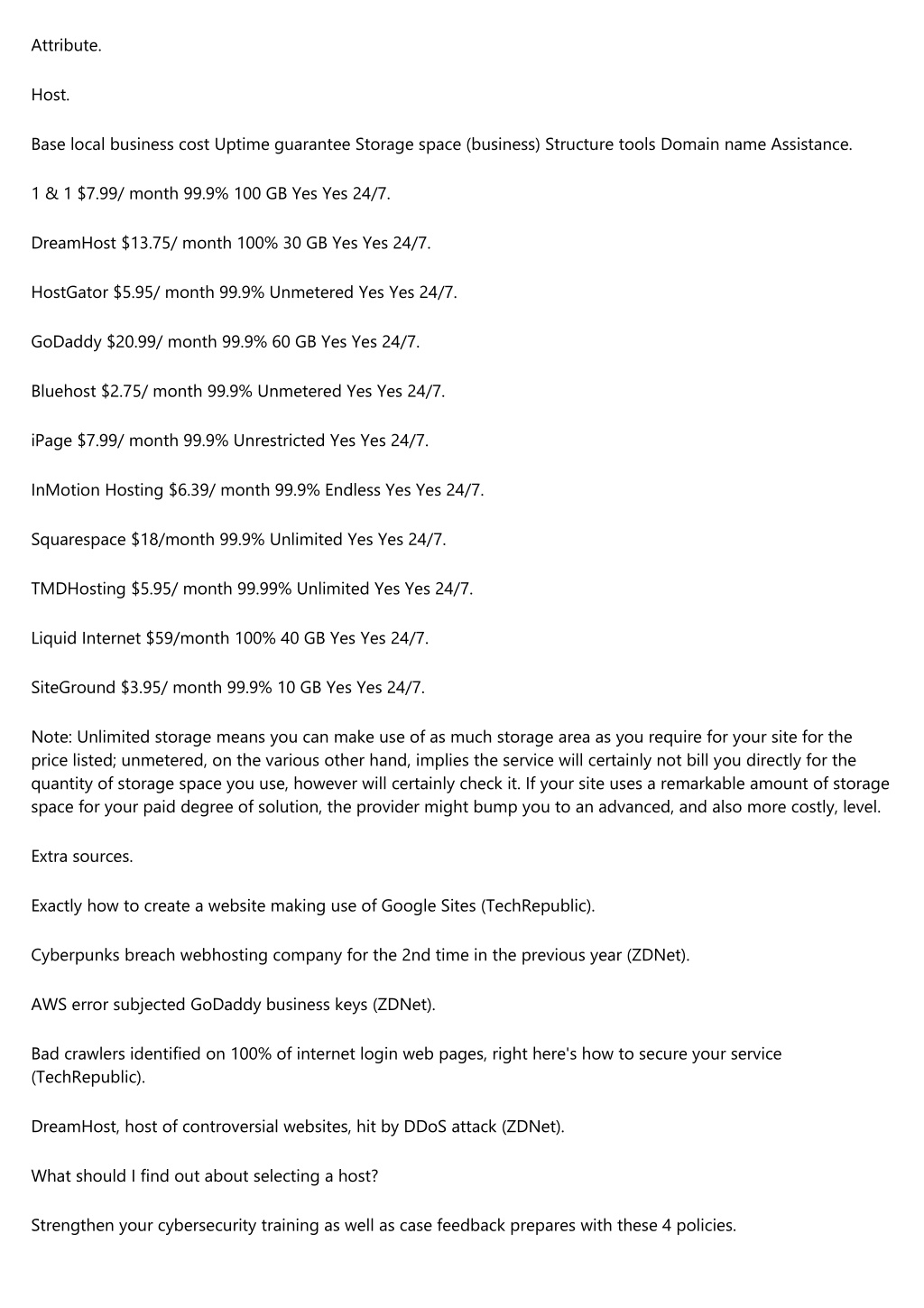 Attribute. Host. Base local business cost Uptime guarantee Storage space (business) Structure tools Domain name Assistance. 1 & 1 $7.99/ month 99.9% 100 GB Yes Yes 24/7. DreamHost $13.75/ month 100% 30 GB Yes Yes 24/7. HostGator $5.95/ month 99.9% Unmetered Yes Yes 24/7. GoDaddy $20.99/ month 99.9% 60 GB Yes Yes 24/7. Bluehost $2.75/ month 99.9% Unmetered Yes Yes 24/7. iPage $7.99/ month 99.9% Unrestricted Yes Yes 24/7. InMotion Hosting $6.39/ month 99.9% Endless Yes Yes 24/7. Squarespace $18/month 99.9% Unlimited Yes Yes 24/7. TMDHosting $5.95/ month 99.99% Unlimited Yes Yes 24/7. Liquid Internet $59/month 100% 40 GB Yes Yes 24/7. SiteGround $3.95/ month 99.9% 10 GB Yes Yes 24/7. Note: Unlimited storage means you can make use of as much storage area as you require for your site for the price listed; unmetered, on the various other hand, implies the service will certainly not bill you directly for the quantity of storage space you use, however will certainly check it. If your site uses a remarkable amount of storage space for your paid degree of solution, the provider might bump you to an advanced, and also more costly, level. Extra sources. Exactly how to create a website making use of Google Sites (TechRepublic). Cyberpunks breach webhosting company for the 2nd time in the previous year (ZDNet). AWS error subjected GoDaddy business keys (ZDNet). Bad crawlers identified on 100% of internet login web pages, right here's how to secure your service (TechRepublic). DreamHost, host of controversial websites, hit by DDoS attack (ZDNet). What should I find out about selecting a host? Strengthen your cybersecurity training as well as case feedback prepares with these 4 policies.
