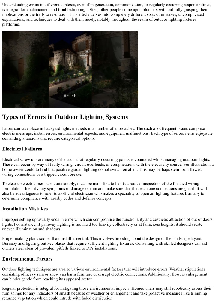 Understanding errors in different contexts, even if in generation, communication, or regularly occurring responsibilities, is integral for enchancment and troubleshooting. Often, other people come upon blunders with out fully grasping their implications or the trails to resolution. This article delves into completely different sorts of mistakes, uncomplicated explanations, and techniques to deal with them nicely, notably throughout the realm of outdoor lighting fixtures platforms. Types of Errors in Outdoor Lighting Systems Errors can take place in backyard lights methods in a number of approaches. The such a lot frequent issues comprise electric mess ups, install errors, environmental aspects, and equipment malfunctions. Each type of errors items enjoyable demanding situations that require categorical options. Electrical Failures Electrical screw ups are many of the such a lot regularly occurring points encountered whilst managing outdoors lights. These can occur by way of faulty wiring, circuit overloads, or complications with the electricity source. For illustration, a home owner could to find that positive garden lighting do not switch on at all. This may perhaps stem from flawed wiring connections or a tripped circuit breaker. To clear up electric mess ups quite simply, it can be main first to habits a radical inspection of the finished wiring formulation. Identify any symptoms of damage or ruin and make sure that that each one connections are guard. It will also be advantageous to refer to a official electrician who makes a speciality of open air lighting fixtures Burnaby to determine compliance with nearby codes and defense concepts. Installation Mistakes Improper setting up usually ends in error which can compromise the functionality and aesthetic attraction of out of doors lights. For instance, if pathway lighting is mounted too heavily collectively or at fallacious heights, it should create uneven illumination and shadows. Proper making plans sooner than install is central. This involves brooding about the design of the landscape layout Burnaby and figuring out key places that require sufficient lighting fixtures. Consulting with skilled designers can aid owners steer clear of prevalent pitfalls linked to DIY installations. Environmental Factors Outdoor lighting techniques are area to various environmental factors that will introduce errors. Weather stipulations consisting of heavy rain or snow can harm furniture or disrupt electric connections. Additionally, flowers enlargement can hinder gentle from reaching its supposed sector. Regular protection is integral for mitigating those environmental impacts. Homeowners may still robotically assess their furnishings for any indicators of smash because of weather or enlargement and take proactive measures like trimming returned vegetation which could intrude with faded distribution.