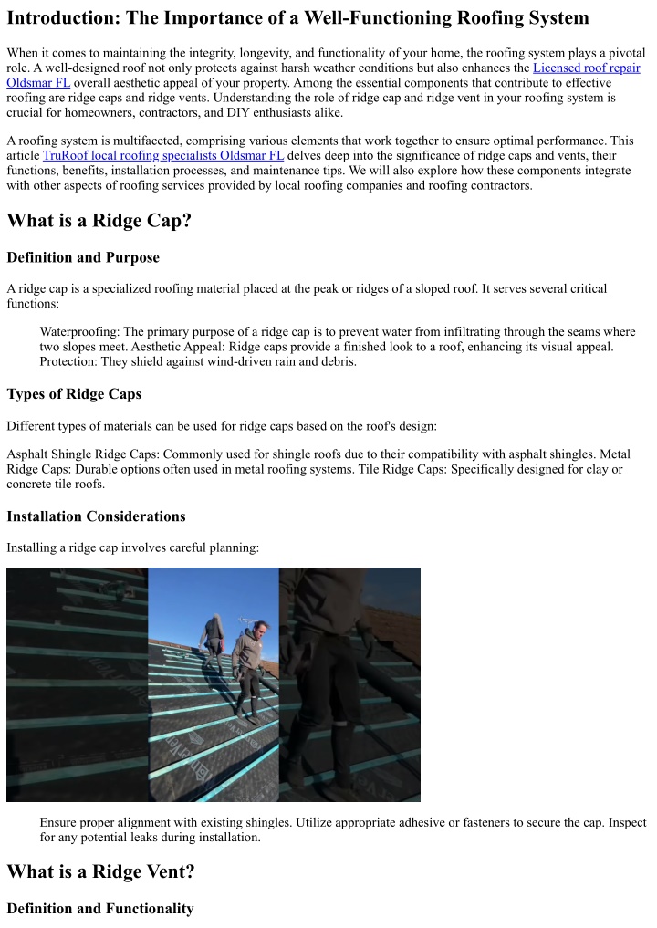 Introduction: The Importance of a Well-Functioning Roofing System When it comes to maintaining the integrity, longevity, and functionality of your home, the roofing system plays a pivotal role. A well-designed roof not only protects against harsh weather conditions but also enhances the Licensed roof repair Oldsmar FL overall aesthetic appeal of your property. Among the essential components that contribute to effective roofing are ridge caps and ridge vents. Understanding the role of ridge cap and ridge vent in your roofing system is crucial for homeowners, contractors, and DIY enthusiasts alike. A roofing system is multifaceted, comprising various elements that work together to ensure optimal performance. This article TruRoof local roofing specialists Oldsmar FL delves deep into the significance of ridge caps and vents, their functions, benefits, installation processes, and maintenance tips. We will also explore how these components integrate with other aspects of roofing services provided by local roofing companies and roofing contractors. What is a Ridge Cap? Definition and Purpose A ridge cap is a specialized roofing material placed at the peak or ridges of a sloped roof. It serves several critical functions: Waterproofing: The primary purpose of a ridge cap is to prevent water from infiltrating through the seams where two slopes meet. Aesthetic Appeal: Ridge caps provide a finished look to a roof, enhancing its visual appeal. Protection: They shield against wind-driven rain and debris. Types of Ridge Caps Different types of materials can be used for ridge caps based on the roof's design: Asphalt Shingle Ridge Caps: Commonly used for shingle roofs due to their compatibility with asphalt shingles. Metal Ridge Caps: Durable options often used in metal roofing systems. Tile Ridge Caps: Specifically designed for clay or concrete tile roofs. Installation Considerations Installing a ridge cap involves careful planning: Ensure proper alignment with existing shingles. Utilize appropriate adhesive or fasteners to secure the cap. Inspect for any potential leaks during installation. What is a Ridge Vent? Definition and Functionality