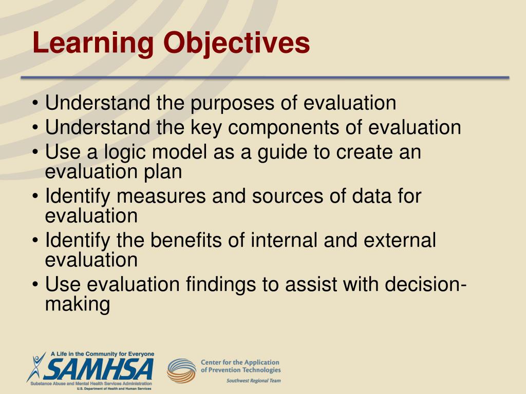 Learning Objectives • Understand the purposes of evaluation • Understand the key components of evaluation • Use a logic model as a guide to create an evaluation plan • Identify measures and sources of data for evaluation • Identify the benefits of internal and external evaluation • Use evaluation findings to assist with decision-making