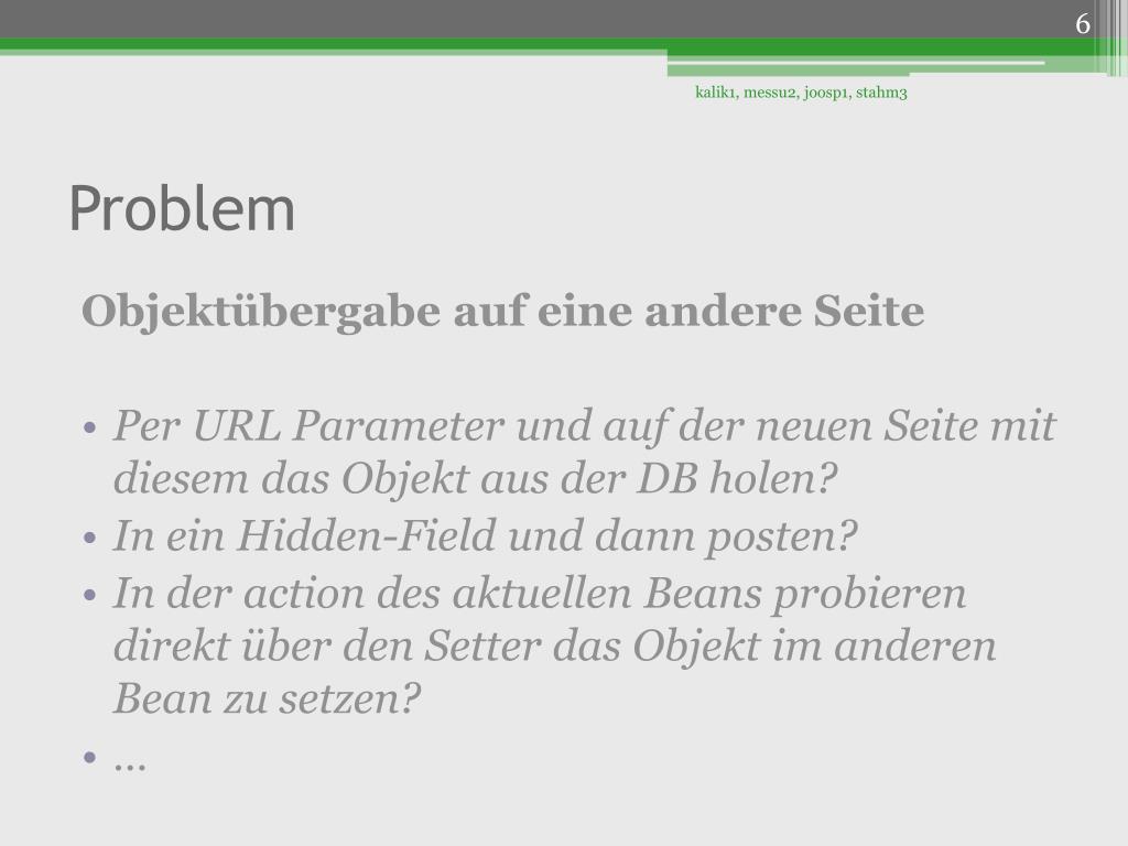 Objektübergabe auf eine andere Seite Per URL Parameter und auf der neuen Seite mit diesem das Objekt aus der DB holen? In ein Hidden-Field und dann posten? In der action des aktuellen Beans probieren direkt über den Setter das Objekt im anderen Bean zu setzen? … kalik1, messu2, joosp1, stahm3 Problem