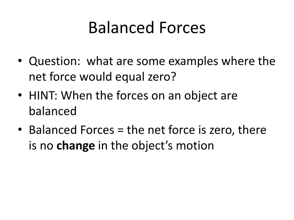 Balanced Forces • Question: what are some examples where the net force would equal zero? • HINT: When the forces on an object are balanced • Balanced Forces = the net force is zero, there is no change in the object’s motion