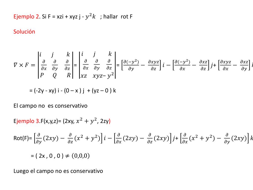 Ejemplo 2. Si F = xzi + xyz j - ; hallar rot F Solución = =+ = (-2y - xy) i - (0 – x ) j + (yz – 0 ) k El campo no es conservativo Ejemplo 3.F(x,y,z)= (2xy, , 2zy) Rot(F)= + = ( 2x , 0 , 0 ) Luego el campo no es conservativo