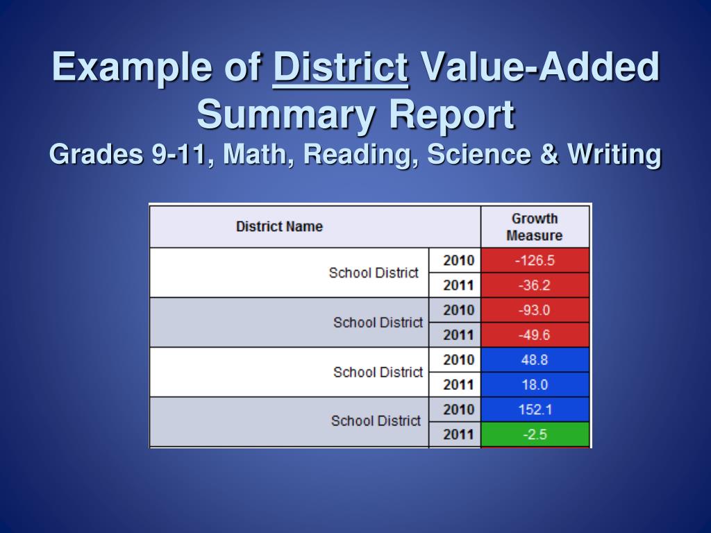 Example of District Value-Added Summary ReportGrades 9-11, Math, Reading, Science & Writing