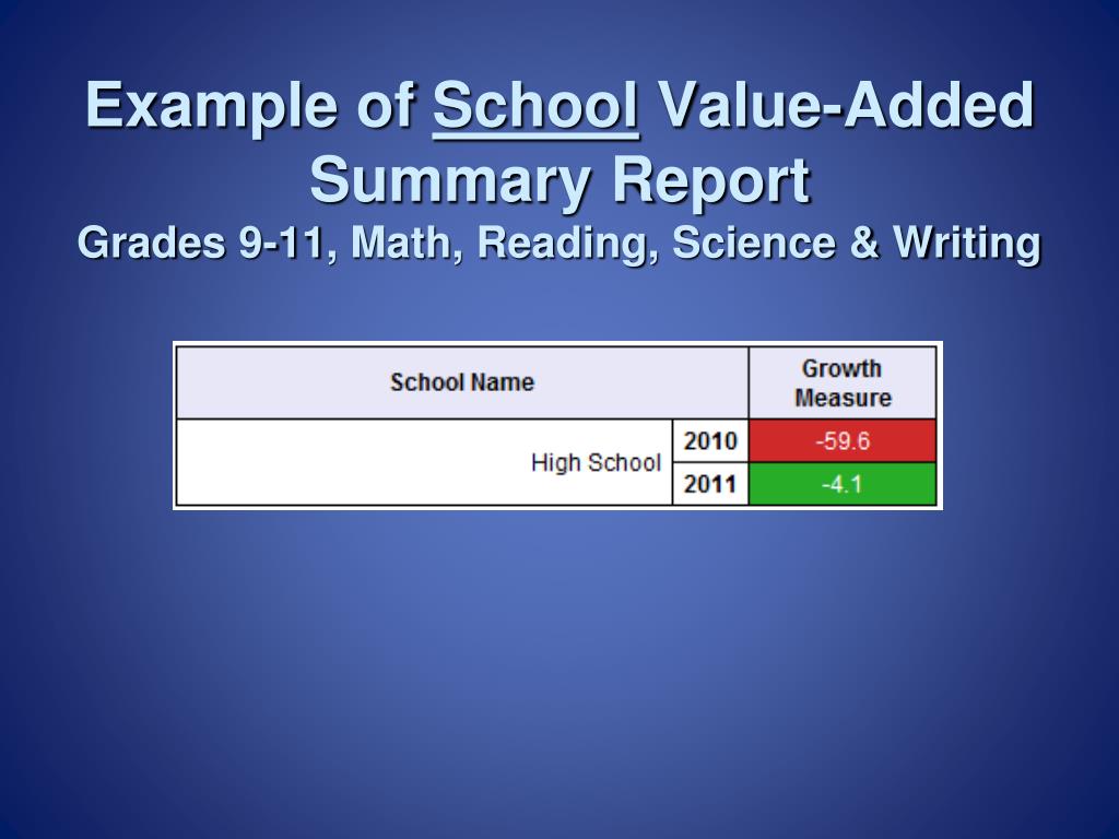Example of School Value-Added Summary ReportGrades 9-11, Math, Reading, Science & Writing