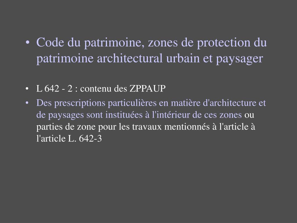 Code du patrimoine, zones de protection du patrimoine architectural urbain et paysager • L 642 - 2 : contenu des ZPPAUP • Des prescriptions particulières en matière d'architecture et de paysages sont instituées à l'intérieur de ces zones ou parties de zone pour les travaux mentionnés à l'article à l'article L. 642-3