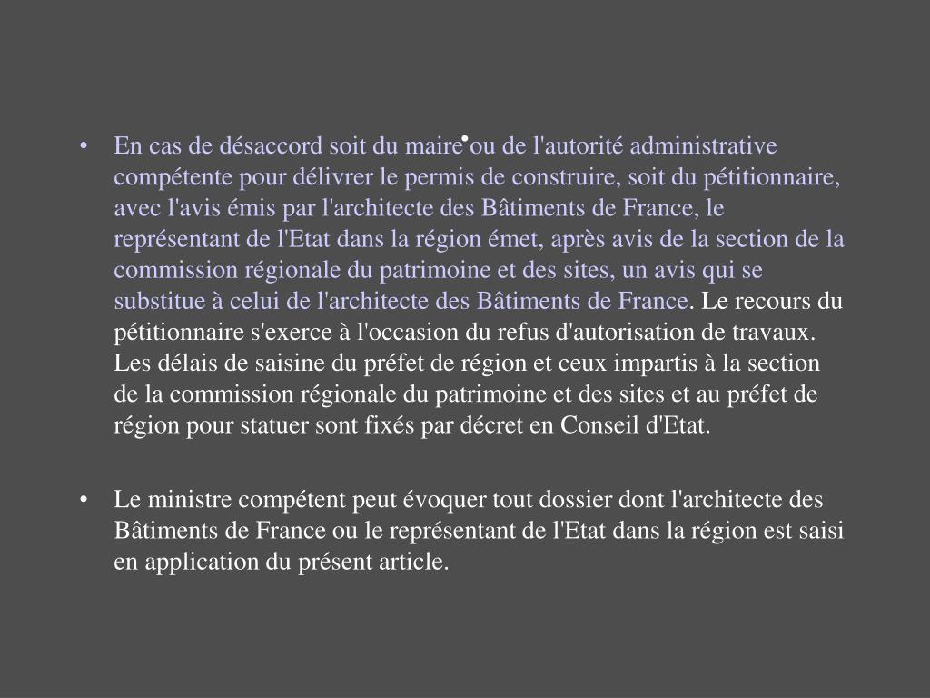 . • En cas de désaccord soit du maire ou de l'autorité administrative compétente pour délivrer le permis de construire, soit du pétitionnaire, avec l'avis émis par l'architecte des Bâtiments de France, le représentant de l'Etat dans la région émet, après avis de la section de la commission régionale du patrimoine et des sites, un avis qui se substitue à celui de l'architecte des Bâtiments de France. Le recours du pétitionnaire s'exerce à l'occasion du refus d'autorisation de travaux. Les délais de saisine du préfet de région et ceux impartis à la section de la commission régionale du patrimoine et des sites et au préfet de région pour statuer sont fixés par décret en Conseil d'Etat. • Le ministre compétent peut évoquer tout dossier dont l'architecte des Bâtiments de France ou le représentant de l'Etat dans la région est saisi en application du présent article.