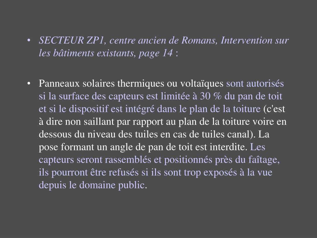 SECTEUR ZP1, centre ancien de Romans, Intervention sur les bâtiments existants, page 14 : • Panneaux solaires thermiques ou voltaïques sont autorisés si la surface des capteurs est limitée à 30 % du pan de toit et si le dispositif est intégré dans le plan de la toiture (c'est à dire non saillant par rapport au plan de la toiture voire en dessous du niveau des tuiles en cas de tuiles canal). La pose formant un angle de pan de toit est interdite. Les capteurs seront rassemblés et positionnés près du faîtage, ils pourront être refusés si ils sont trop exposés à la vue depuis le domaine public.