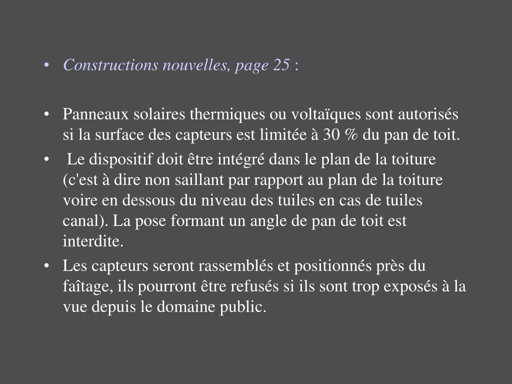 Constructions nouvelles, page 25 : • Panneaux solaires thermiques ou voltaïques sont autorisés si la surface des capteurs est limitée à 30 % du pan de toit. • Le dispositif doit être intégré dans le plan de la toiture (c'est à dire non saillant par rapport au plan de la toiture voire en dessous du niveau des tuiles en cas de tuiles canal). La pose formant un angle de pan de toit est interdite. • Les capteurs seront rassemblés et positionnés près du faîtage, ils pourront être refusés si ils sont trop exposés à la vue depuis le domaine public.