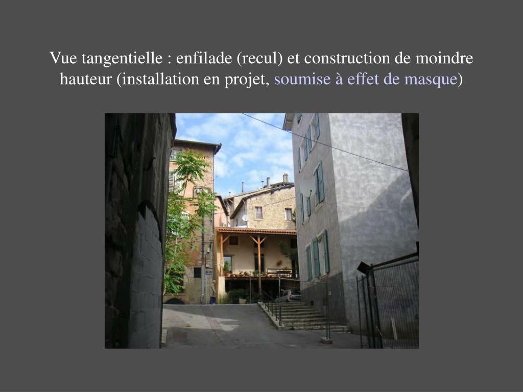 Vue tangentielle : enfilade (recul) et construction de moindre hauteur (installation en projet, soumise à effet de masque)