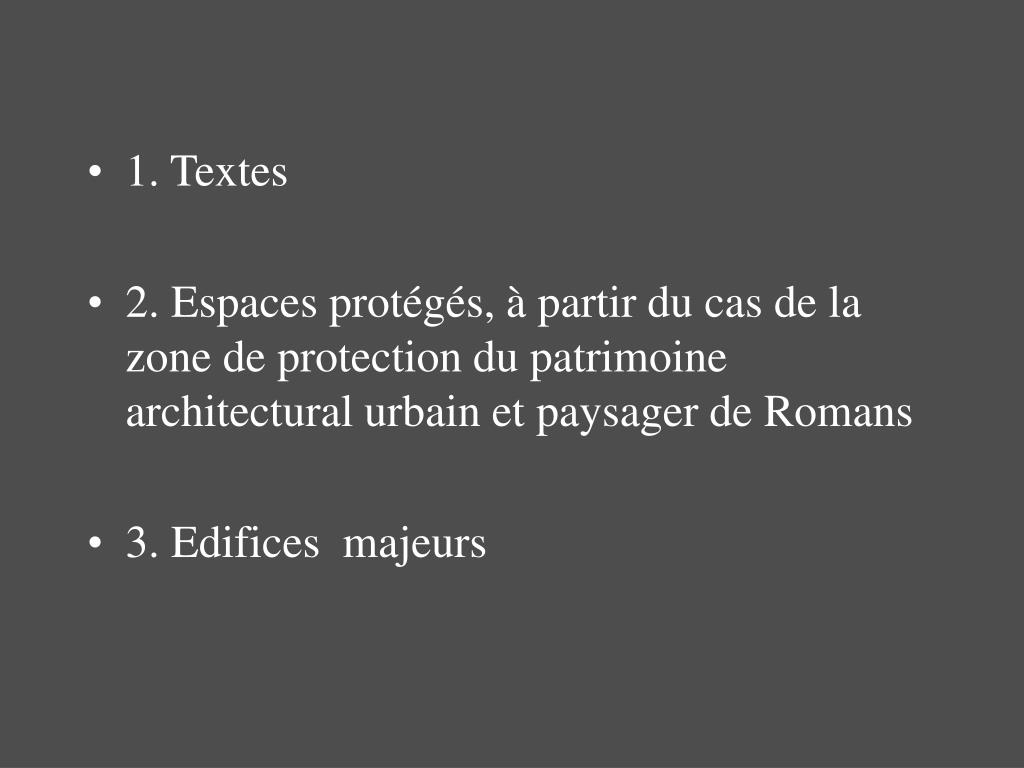 1. Textes • 2. Espaces protégés, à partir du cas de la zone de protection du patrimoine architectural urbain et paysager de Romans • 3. Edifices majeurs
