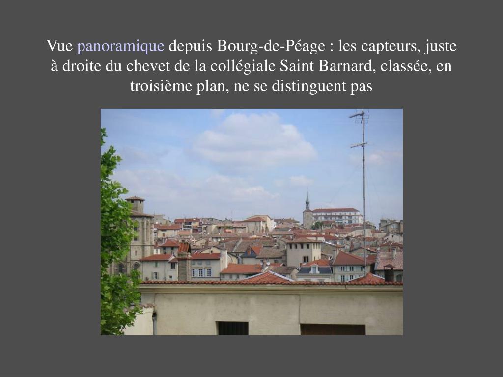 Vue panoramique depuis Bourg-de-Péage : les capteurs, juste à droite du chevet de la collégiale Saint Barnard, classée, en troisième plan, ne se distinguent pas