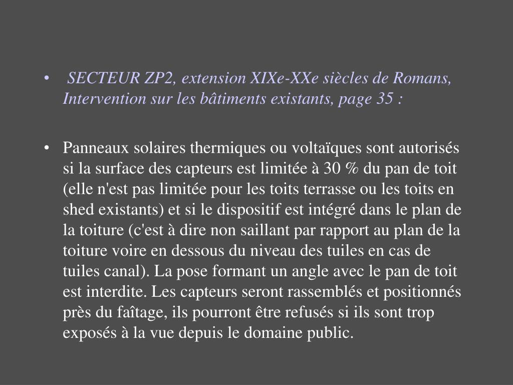 SECTEUR ZP2, extension XIXe-XXe siècles de Romans, Intervention sur les bâtiments existants, page 35 : • Panneaux solaires thermiques ou voltaïques sont autorisés si la surface des capteurs est limitée à 30 % du pan de toit (elle n'est pas limitée pour les toits terrasse ou les toits en shed existants) et si le dispositif est intégré dans le plan de la toiture (c'est à dire non saillant par rapport au plan de la toiture voire en dessous du niveau des tuiles en cas de tuiles canal). La pose formant un angle avec le pan de toit est interdite. Les capteurs seront rassemblés et positionnés près du faîtage, ils pourront être refusés si ils sont trop exposés à la vue depuis le domaine public.