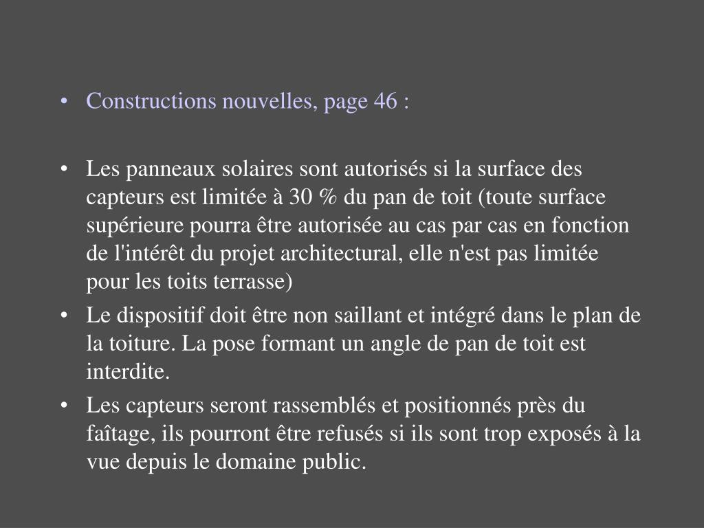 Constructions nouvelles, page 46 : • Les panneaux solaires sont autorisés si la surface des capteurs est limitée à 30 % du pan de toit (toute surface supérieure pourra être autorisée au cas par cas en fonction de l'intérêt du projet architectural, elle n'est pas limitée pour les toits terrasse) • Le dispositif doit être non saillant et intégré dans le plan de la toiture. La pose formant un angle de pan de toit est interdite. • Les capteurs seront rassemblés et positionnés près du faîtage, ils pourront être refusés si ils sont trop exposés à la vue depuis le domaine public.