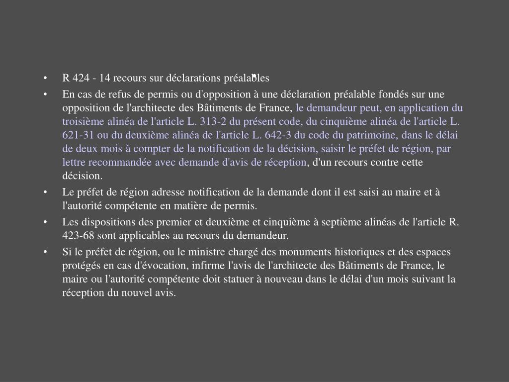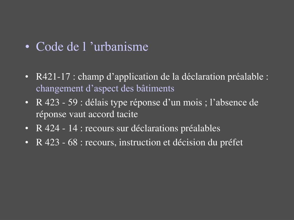Code de l ’urbanisme • R421-17 : champ d’application de la déclaration préalable : changement d’aspect des bâtiments • R 423 - 59 : délais type réponse d’un mois ; l’absence de réponse vaut accord tacite • R 424 - 14 : recours sur déclarations préalables • R 423 - 68 : recours, instruction et décision du préfet