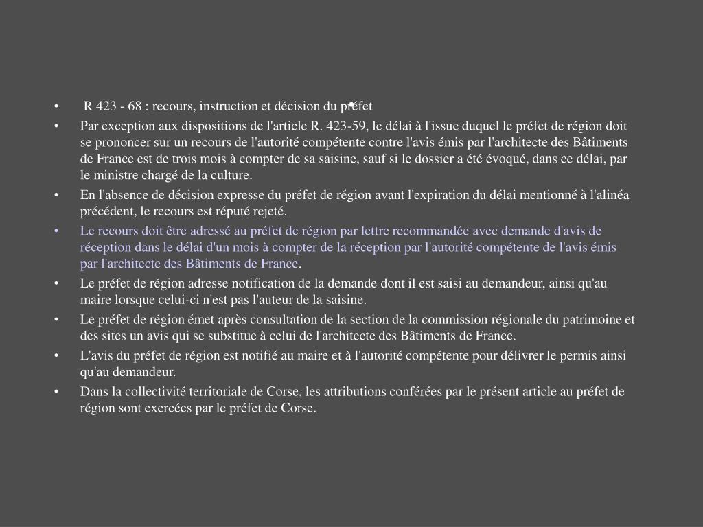 . • R 423 - 68 : recours, instruction et décision du préfet • Par exception aux dispositions de l'article R. 423-59, le délai à l'issue duquel le préfet de région doit se prononcer sur un recours de l'autorité compétente contre l'avis émis par l'architecte des Bâtiments de France est de trois mois à compter de sa saisine, sauf si le dossier a été évoqué, dans ce délai, par le ministre chargé de la culture. • En l'absence de décision expresse du préfet de région avant l'expiration du délai mentionné à l'alinéa précédent, le recours est réputé rejeté. • Le recours doit être adressé au préfet de région par lettre recommandée avec demande d'avis de réception dans le délai d'un mois à compter de la réception par l'autorité compétente de l'avis émis par l'architecte des Bâtiments de France. • Le préfet de région adresse notification de la demande dont il est saisi au demandeur, ainsi qu'au maire lorsque celui-ci n'est pas l'auteur de la saisine. • Le préfet de région émet après consultation de la section de la commission régionale du patrimoine et des sites un avis qui se substitue à celui de l'architecte des Bâtiments de France. • L'avis du préfet de région est notifié au maire et à l'autorité compétente pour délivrer le permis ainsi qu'au demandeur. • Dans la collectivité territoriale de Corse, les attributions conférées par le présent article au préfet de région sont exercées par le préfet de Corse.