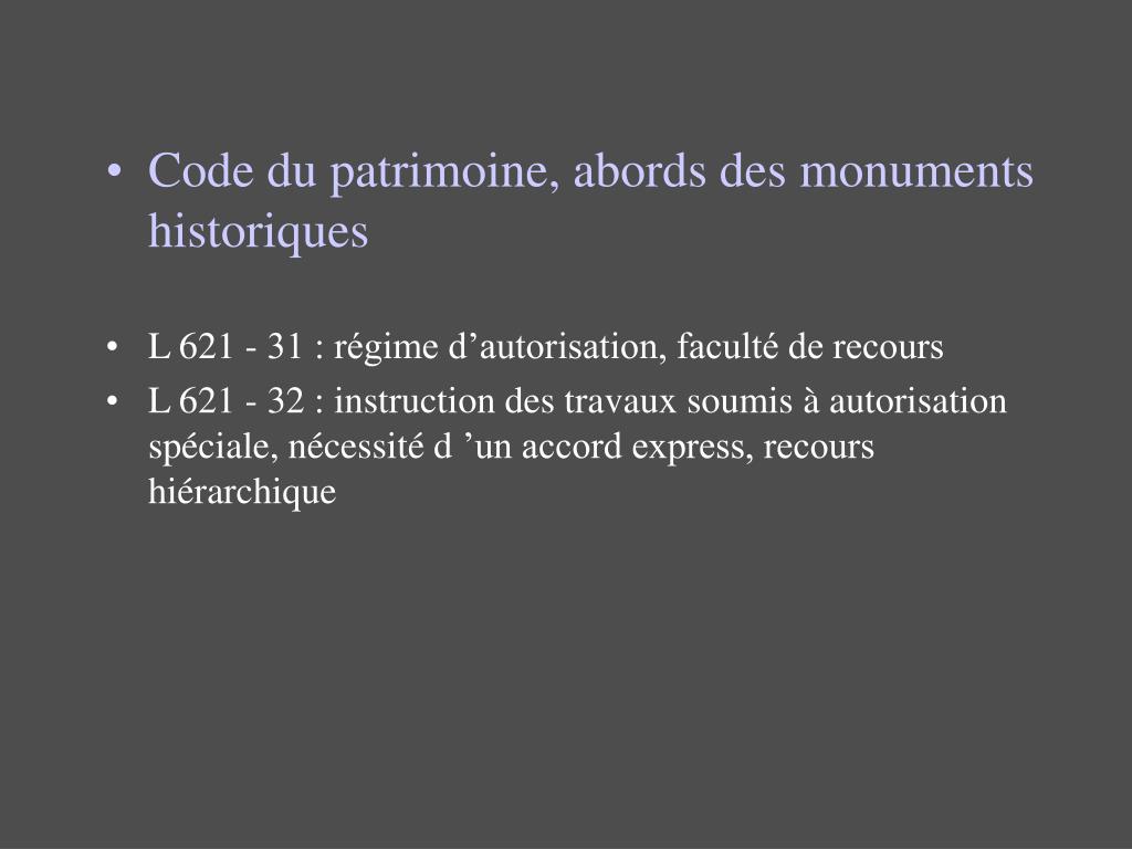 Code du patrimoine, abords des monuments historiques • L 621 - 31 : régime d’autorisation, faculté de recours • L 621 - 32 : instruction des travaux soumis à autorisation spéciale, nécessité d ’un accord express, recours hiérarchique