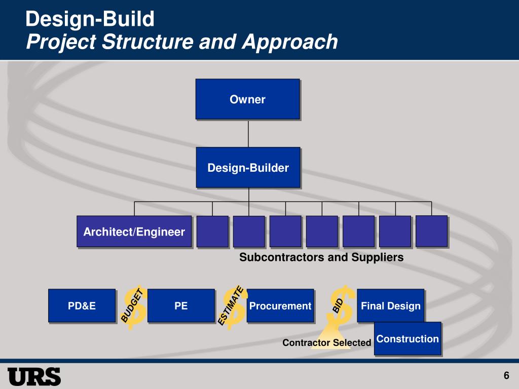 Design-BuildProject Structure and Approach Owner Design-Builder Architect/Engineer Subcontractors and Suppliers $ $ $ PD&E PE Procurement Final Design BUDGET ESTIMATE BID Construction Contractor Selected