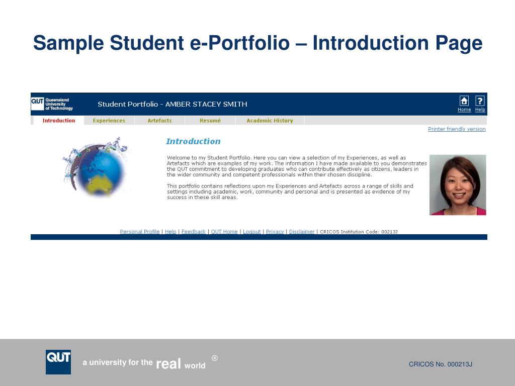 Purpose of the QUT Student e-Portfolio To enable students to record, reflect on, catalogue, retrieve and present their experiences, activities, and things they produce both inside and outside of university life as evidence of the skills developed while at QUT that contribute significantly to their lifelong learning and career development.