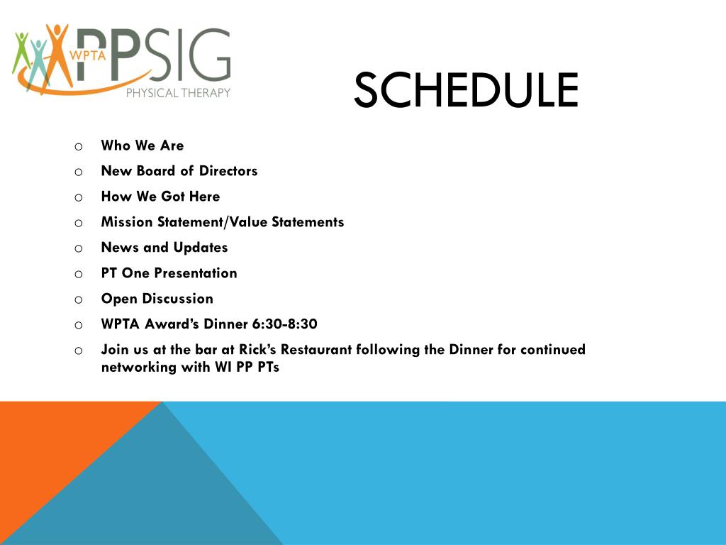 Schedule • Who We Are • New Board of Directors • How We Got Here • Mission Statement/Value Statements • News and Updates • PT One Presentation • Open Discussion • WPTA Award’s Dinner 6:30-8:30 • Join us at the bar at Rick’s Restaurant following the Dinner for continued networking with WI PP PTs