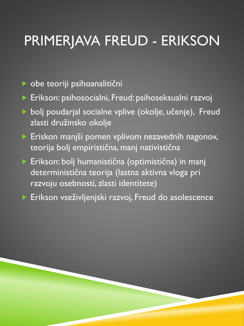 PRIMERJAVA FREUD - ERIKSON • obe teoriji psihoanalitični • Erikson: psihosocialni, Freud: psihoseksualni razvoj • bolj poudarjal socialne vplive (okolje, učenje), Freud zlasti družinsko okolje • Eriskon manjši pomen vplivom nezavednih nagonov, teorija bolj empiristična, manj nativistična • Erikson: bolj humanistična (optimistična) in manj deterministična teorija (lastna aktivna vloga pri razvoju osebnosti, zlasti identitete) • Eriksonvseživljenjski razvoj, Freud do asolescence