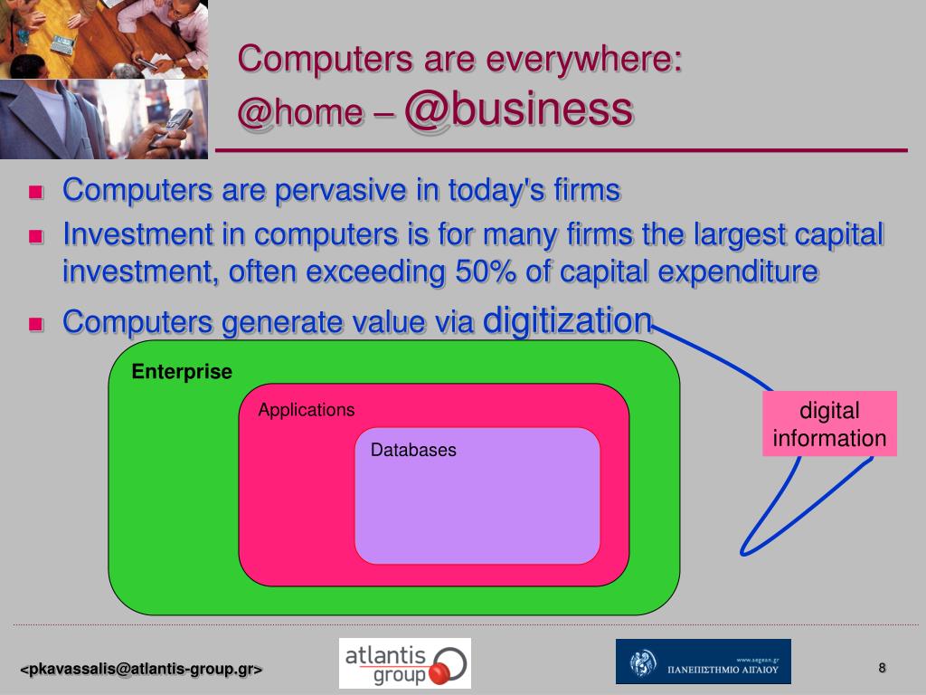 Computers are everywhere: @home – @business • Computers are pervasive in today's firms • Investment in computers is for many firms the largest capital investment, often exceeding 50% of capital expenditure • Computers generate value via digitization Enterprise Applications digital information Databases
