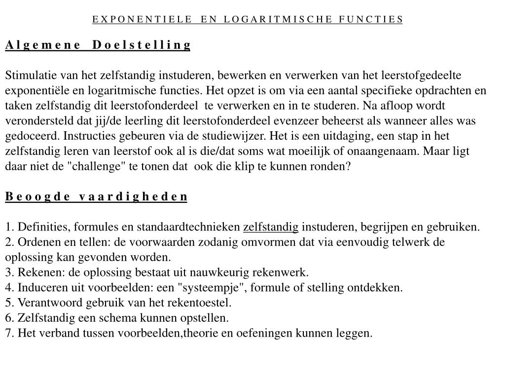 E X P O N E N T I E L E E N L O G A R I T M I S C H E F U N C T I E S A l g e m e n e D o e l s t e l l i n g Stimulatie van het zelfstandig instuderen, bewerken en verwerken van het leerstofgedeelte exponentiële en logaritmische functies. Het opzet is om via een aantal specifieke opdrachten en taken zelfstandig dit leerstofonderdeel te verwerken en in te studeren. Na afloop wordt verondersteld dat jij/de leerling dit leerstofonderdeel evenzeer beheerst als wanneer alles was gedoceerd. Instructies gebeuren via de studiewijzer. Het is een uitdaging, een stap in het zelfstandig leren van leerstof ook al is die/dat soms wat moeilijk of onaangenaam. Maar ligt daar niet de "challenge" te tonen dat ook die klip te kunnen ronden? B e o o g d e v a a r d i g h e d e n 1. Definities, formules en standaardtechnieken zelfstandig instuderen, begrijpen en gebruiken. 2. Ordenen en tellen: de voorwaarden zodanig omvormen dat via eenvoudig telwerk de oplossing kan gevonden worden. 3. Rekenen: de oplossing bestaat uit nauwkeurig rekenwerk. 4. Induceren uit voorbeelden: een "systeempje", formule of stelling ontdekken. 5. Verantwoord gebruik van het rekentoestel. 6. Zelfstandig een schema kunnen opstellen. 7. Het verband tussen voorbeelden,theorie en oefeningen kunnen leggen.