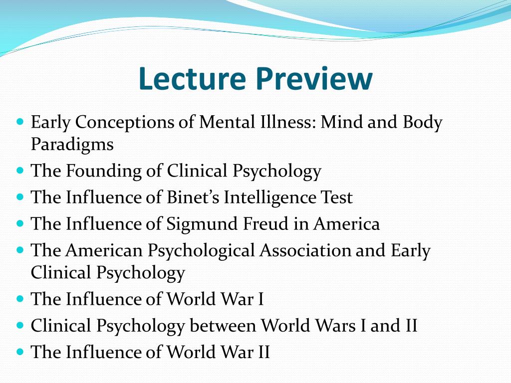 Foundations and Early History of Clinical Psychology. Lecture Preview. Early Conceptions of Mental Illness: Mind and Body Paradigms The Founding of Clinical Psychology The Influence of Binet’s Intelligence Test The Influence of Sigmund Freud in America