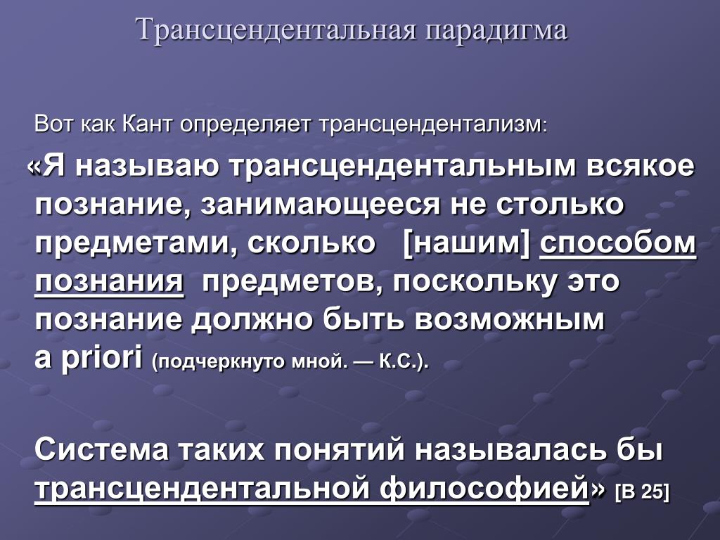 Трансцендентальная парадигма Вот как Кант определяет трансцендентализм: «Я называю трансцендентальным всякое познание, занимающееся не столько предметами, сколько [нашим]способом познанияпредметов, поскольку это познание должно быть возможным a priori(подчеркнуто мной. — К.С.). Система таких понятий называлась бы трансцендентальной философией»[В 25]