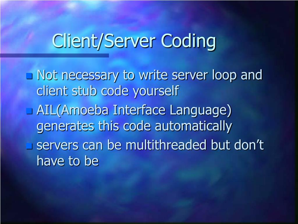 Client/Server Coding • Not necessary to write server loop and client stub code yourself • AIL(Amoeba Interface Language) generates this code automatically • servers can be multithreaded but don’t have to be