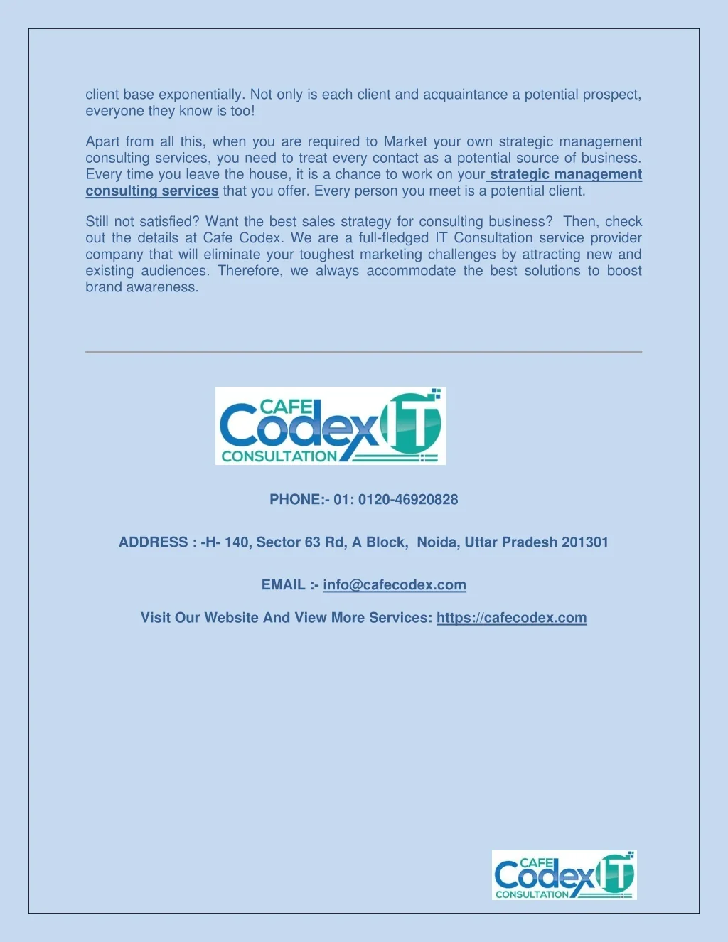client base exponentially. Not only is each client and acquaintance a potential prospect, everyone they know is too! Apart from all this, when you are required to Market your own strategic management consulting services, you need to treat every contact as a potential source of business. Every time you leave the house, it is a chance to work on your strategic management consulting services that you offer. Every person you meet is a potential client. Still not satisfied? Want the best sales strategy for consulting business? Then, check out the details at Cafe Codex. We are a full-fledged IT Consultation service provider company that will eliminate your toughest marketing challenges by attracting new and existing audiences. Therefore, we always accommodate the best solutions to boost brand awareness. PHONE:- 01: 0120-46920828 ADDRESS : -H- 140, Sector 63 Rd, A Block, Noida, Uttar Pradesh 201301 EMAIL :- info@cafecodex.com Visit Our Website And View More Services: https://cafecodex.com