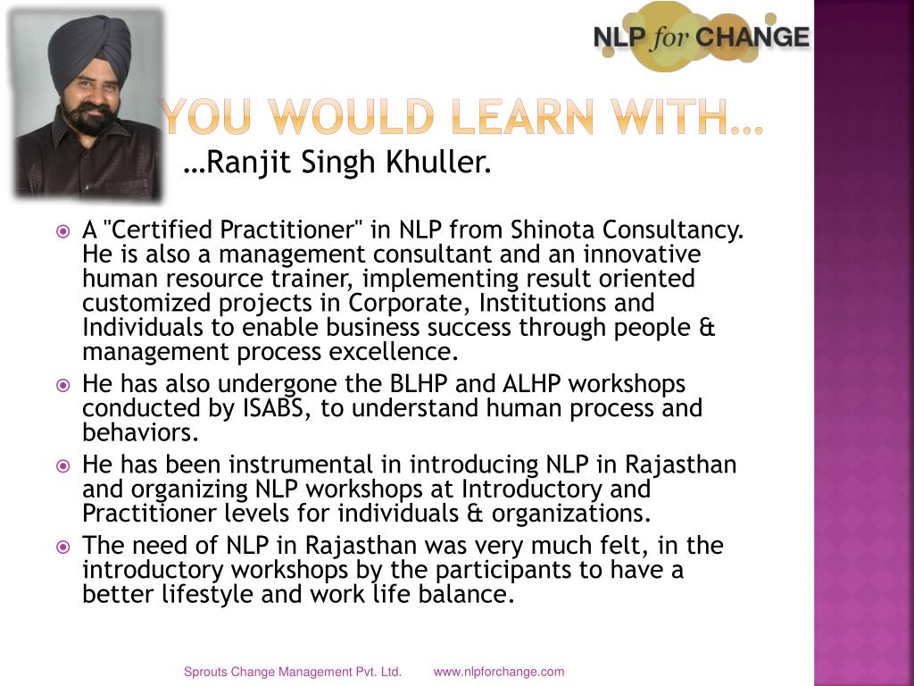 You would Learn with… …Ranjit Singh Khuller. • A "Certified Practitioner" in NLP from Shinota Consultancy. He is also a management consultant and an innovative human resource trainer, implementing result oriented customized projects in Corporate, Institutions and Individuals to enable business success through people & management process excellence. • He has also undergone the BLHP and ALHP workshops conducted by ISABS, to understand human process and behaviors. • He has been instrumental in introducing NLP in Rajasthan and organizing NLP workshops at Introductory and Practitioner levels for individuals & organizations. • The need of NLP in Rajasthan was very much felt, in the introductory workshops by the participants to have a better lifestyle and work life balance. Sprouts Change Management Pvt. Ltd.