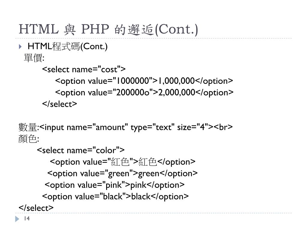 HTML 與 PHP 的邂逅(Cont.) • HTML程式碼(Cont.) 單價: <select name="cost"> <option value="1000000">1,000,000</option> <option value="200000o">2,000,000</option> </select> 數量:<input name="amount" type="text" size="4"><br> 顏色: <select name="color"> <option value="紅色">紅色</option> <option value="green">green</option> <option value="pink">pink</option> <option value="black">black</option> </select>