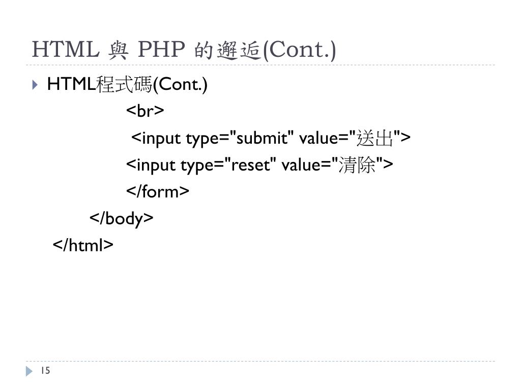 HTML 與 PHP 的邂逅(Cont.) • HTML程式碼(Cont.) <br> <input type="submit" value="送出"> <input type="reset" value="清除"> </form> </body> </html>