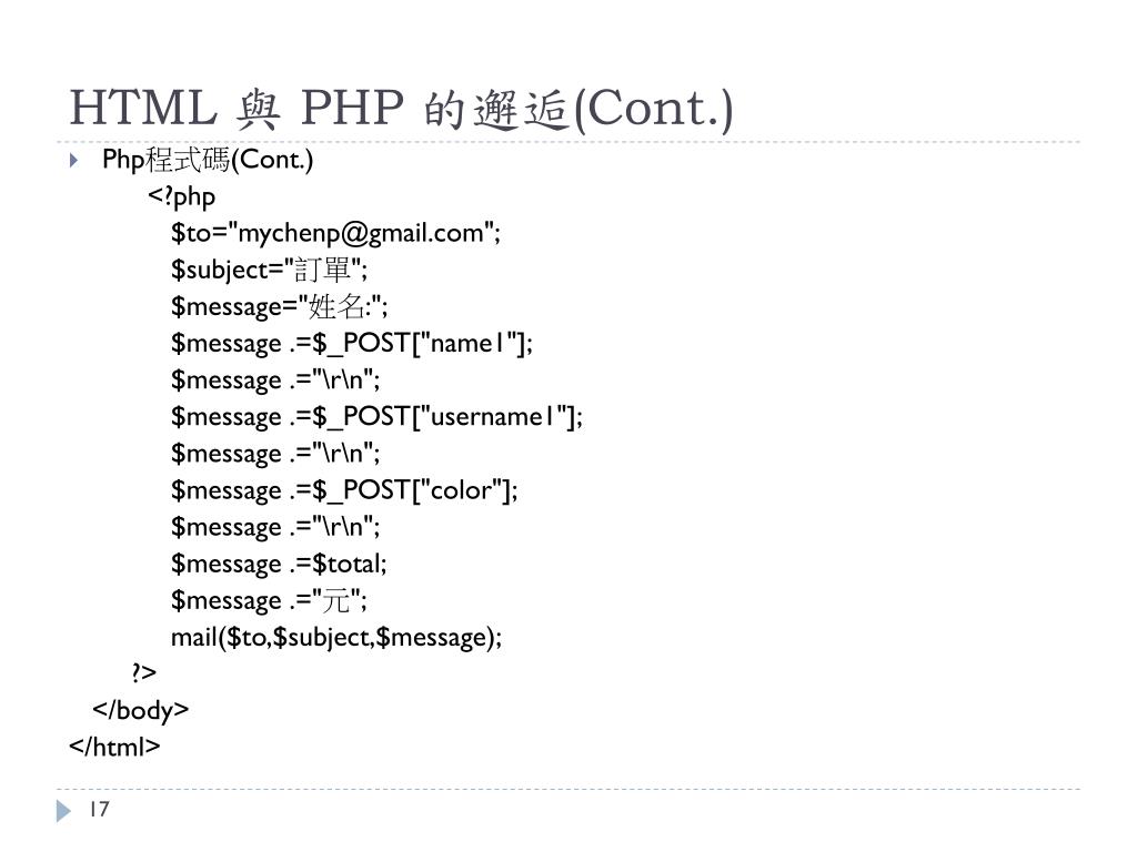HTML 與 PHP 的邂逅(Cont.) • Php程式碼(Cont.) <?php $to="mychenp@gmail.com"; $subject="訂單"; $message="姓名:"; $message .=$_POST["name1"]; $message .="\r\n"; $message .=$_POST["username1"]; $message .="\r\n"; $message .=$_POST["color"]; $message .="\r\n"; $message .=$total; $message .="元"; mail($to,$subject,$message); ?> </body> </html>