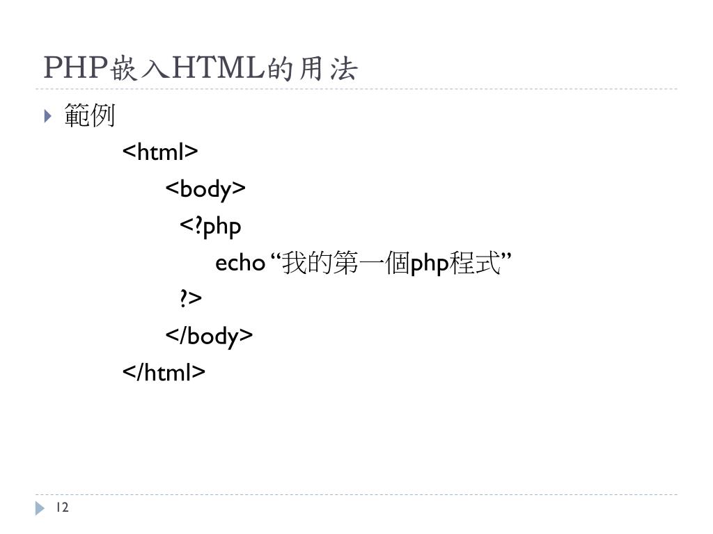 PHP嵌入HTML的用法 • 範例 <html> <body> <?php echo “我的第一個php程式” ?> </body> </html>
