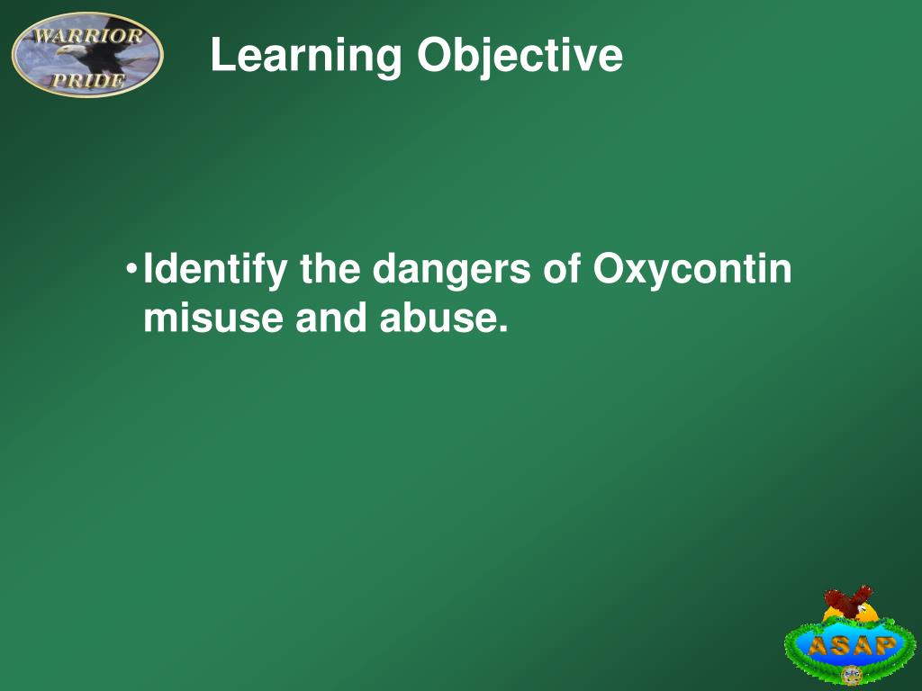 Learning Objective • Identify the dangers of Oxycontin misuse and abuse.