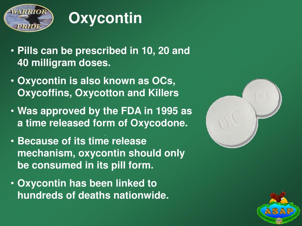 Oxycontin • Pills can be prescribed in 10, 20 and 40 milligram doses. • Oxycontin is also known as OCs, Oxycoffins, Oxycotton and Killers • Was approved by the FDA in 1995 as a time released form of Oxycodone. • Because of its time release mechanism, oxycontin should only be consumed in its pill form. • Oxycontin has been linked to hundreds of deaths nationwide.