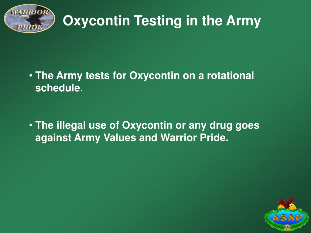 Oxycontin Testing in the Army • The Army tests for Oxycontin on a rotational schedule. • The illegal use of Oxycontin or any drug goes against Army Values and Warrior Pride.