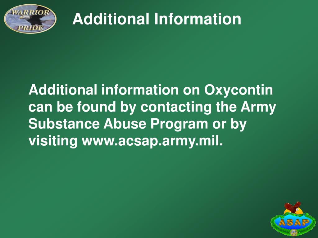 Additional Information Additional information on Oxycontin can be found by contacting the Army Substance Abuse Program or by visiting www.acsap.army.mil.