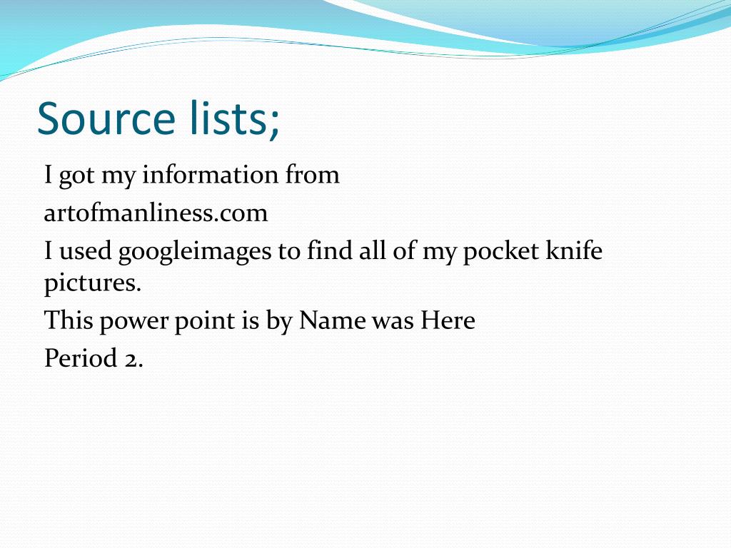 Source lists; I got my information from artofmanliness.com I used googleimages to find all of my pocket knife pictures. This power point is by Name was Here Period 2.