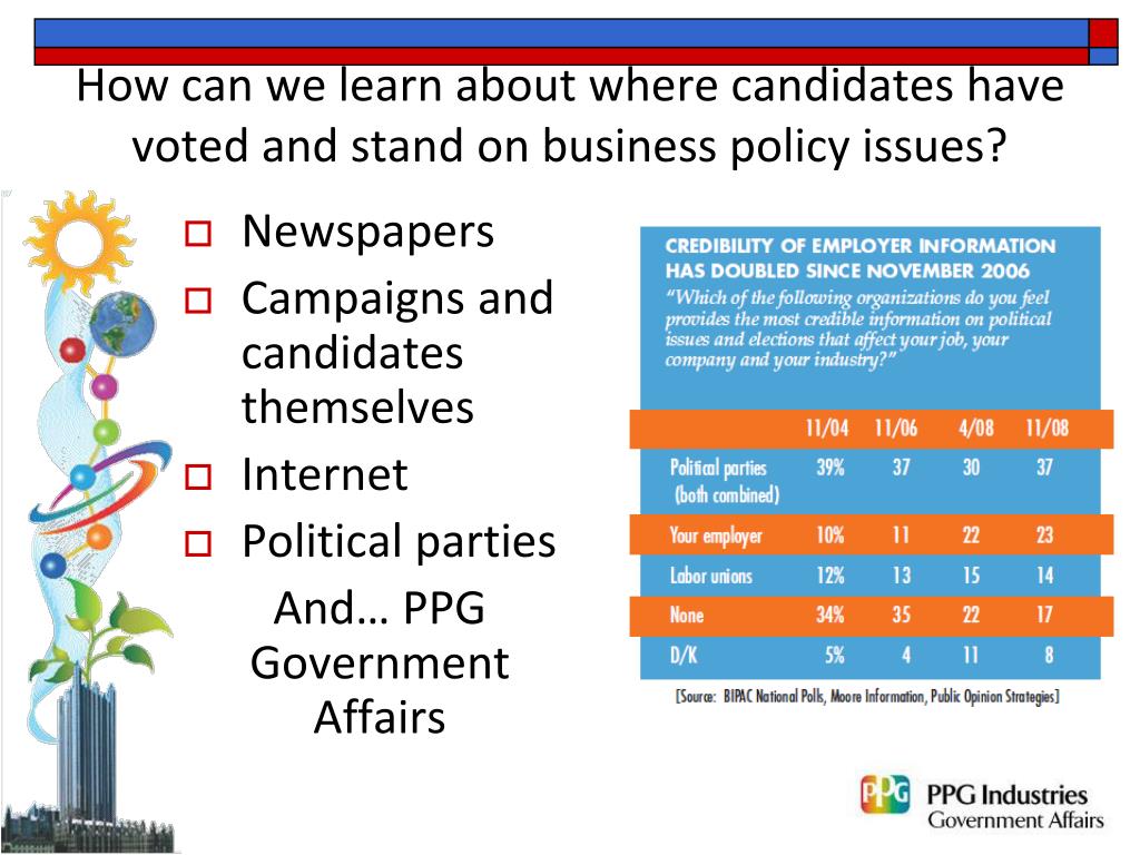How can we learn about where candidates have voted and stand on business policy issues? • Newspapers • Campaigns and candidates themselves • Internet • Political parties And… PPG Government Affairs
