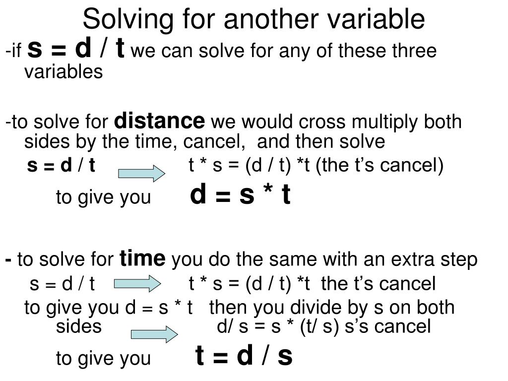 Solving for another variable -if s = d / t we can solve for any of these three variables -to solve for distance we would cross multiply both sides by the time, cancel, and then solve s = d / t t * s = (d / t) *t (the t’s cancel) to give you d = s * t - to solve for time you do the same with an extra step s = d / t t * s = (d / t) *t the t’s cancel to give you d = s * t then you divide by s on both sides d/ s = s * (t/ s) s’s cancel to give yout = d / s