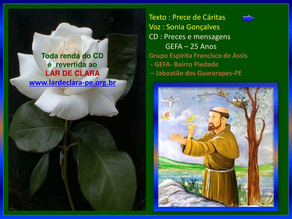 Texto : Prece de Cáritas Voz : Sonia Gonçalves CD : Preces e mensagens GEFA – 25 Anos Grupo Espírita Francisco de Assis - GEFA- Bairro Piedade – Jaboatão dos Guararapes-PE Toda renda do CD é revertida ao LAR DE CLARA www.lardeclara-pe.org.br
