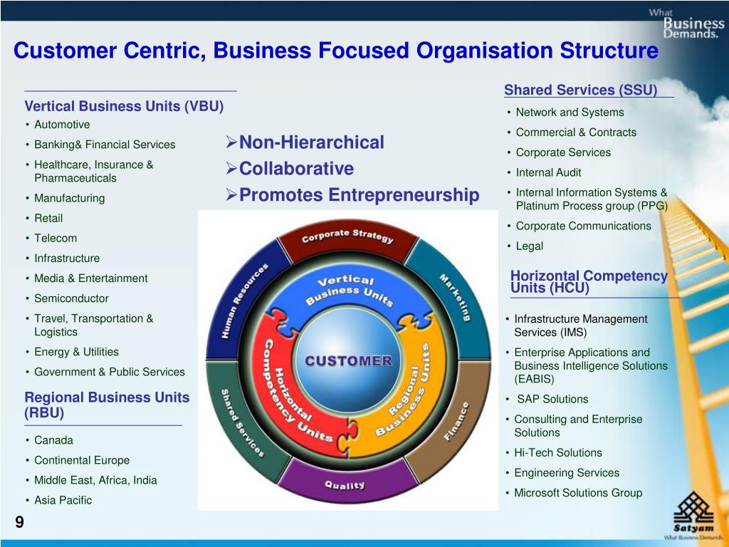 Customer Centric, Business Focused Organisation Structure SharedServices (SSU) Vertical Business Units (VBU) • Network and Systems • Commercial & Contracts • Corporate Services • Internal Audit • Internal Information Systems & Platinum Process group (PPG) • Corporate Communications • Legal • Automotive • Banking& Financial Services • Healthcare, Insurance & Pharmaceuticals • Manufacturing • Retail • Telecom • Infrastructure • Media & Entertainment • Semiconductor • Travel, Transportation & Logistics • Energy & Utilities • Government & Public Services • Non-Hierarchical • Collaborative • Promotes Entrepreneurship Horizontal Competency Units (HCU) • Infrastructure Management Services (IMS) • Enterprise Applications and Business Intelligence Solutions (EABIS) • SAP Solutions • Consulting and Enterprise Solutions • Hi-Tech Solutions • Engineering Services • Microsoft Solutions Group Regional Business Units (RBU) • Canada • Continental Europe • Middle East, Africa, India • Asia Pacific
