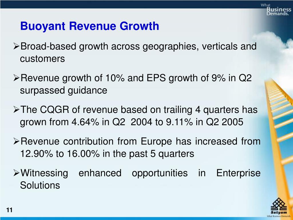 Buoyant Revenue Growth • Broad-based growth across geographies, verticals and customers • Revenue growth of 10% and EPS growth of 9% in Q2 surpassed guidance • The CQGR of revenue based on trailing 4 quarters has grown from 4.64% in Q2 2004 to 9.11% in Q2 2005 • Revenue contribution from Europe has increased from 12.90% to 16.00% in the past 5 quarters • Witnessing enhanced opportunities in Enterprise Solutions