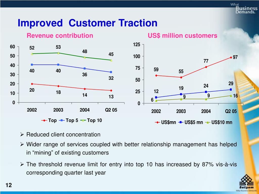 Improved Customer Traction Revenue contribution US$ million customers • Reduced client concentration • Wider range of services coupled with better relationship management has helped in “mining” of existing customers • The threshold revenue limit for entry into top 10 has increased by 87% vis-à-vis corresponding quarter last year