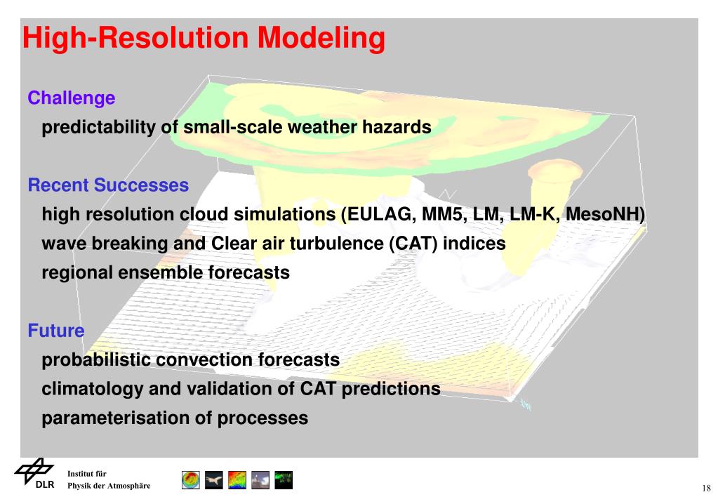 High-Resolution Modeling • Challenge • predictability of small-scale weather hazards • Recent Successes • high resolution cloud simulations (EULAG, MM5, LM, LM-K, MesoNH) • wave breaking and Clear air turbulence (CAT) indices • regional ensemble forecasts • Future • probabilistic convection forecasts • climatology and validation of CAT predictions • parameterisation of processes