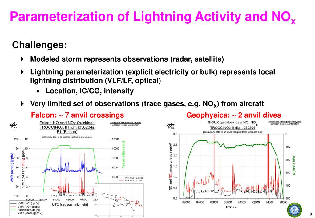 Parameterization of Lightning Activity and NOx • Challenges: • Modeled storm represents observations (radar, satellite) • Lightning parameterization (explicit electricity or bulk) represents local lightning distribution (VLF/LF, optical) • Location, IC/CG, intensity • Very limited set of observations (trace gases, e.g. NOX) from aircraft Falcon: ~ 7 anvil crossings Geophysica: ~ 2 anvil dives